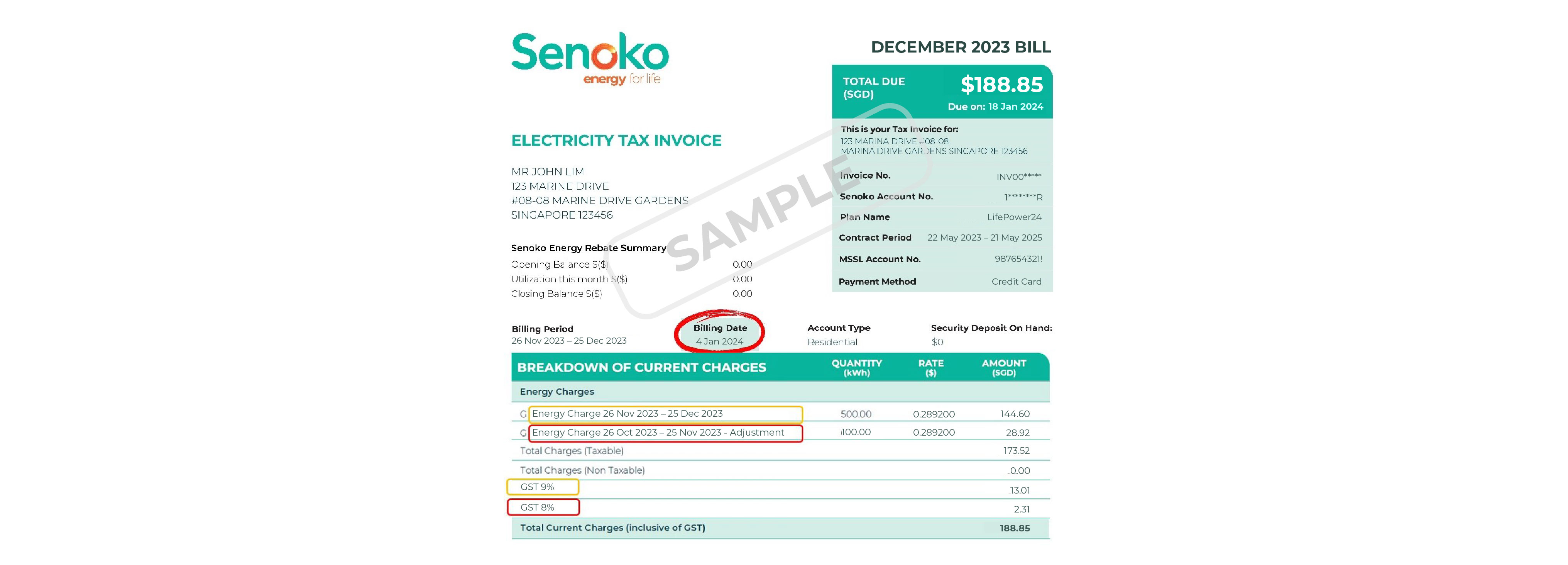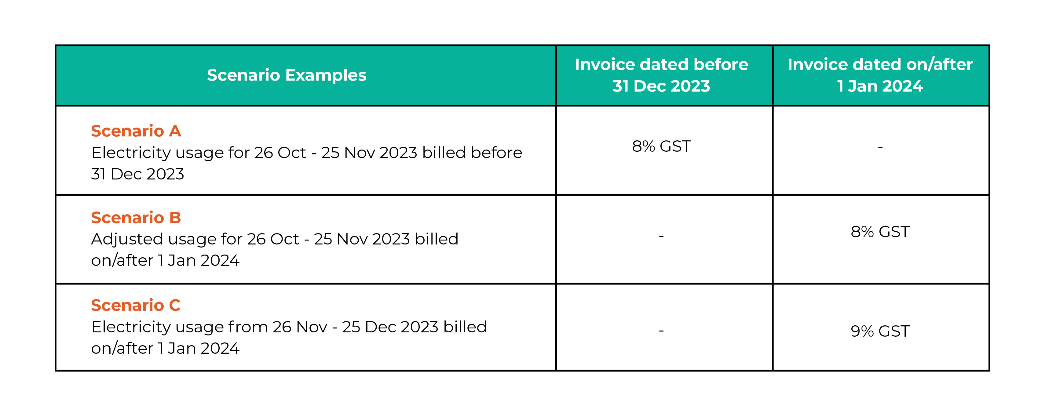 Your electricity invoices dated on or after 1 Jan 2024 will reflect the new 9% GST rate.