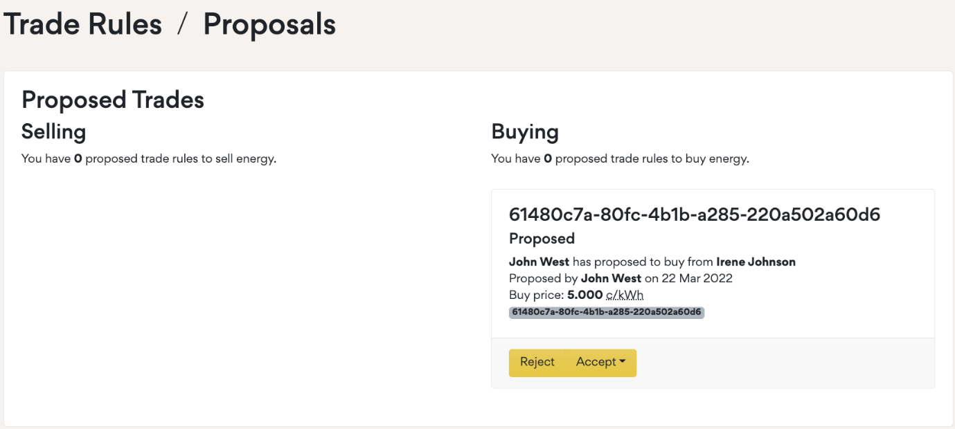 An offer to buy or sell is made (proposing a price) and sent to the other party through the designated email address(es) and they either accept or reject it. In the case of “Buy” trades, a Consumer can set priority for their matched Prosumers.