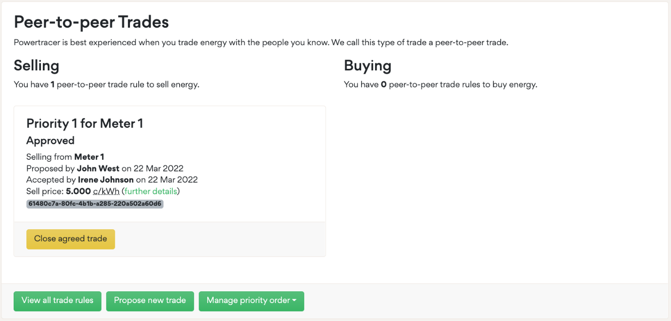 On the SolarShare platform, you can see a unique trade identifier code for every 30 min trade. The counterparty to this trade will see exactly the same identifier on their system, and an audit service is available to trace all trading records and prove their veracity.